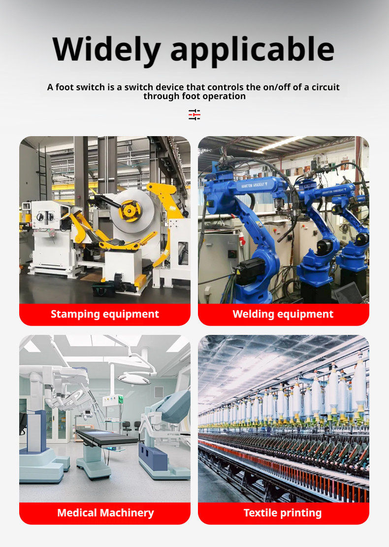 A device that controls the circuit's on/off state via foot operation, primarily designed for hands-free operation scenarios. It finds extensive application in medical, industrial manufacturing, and electronic equipment sectors.