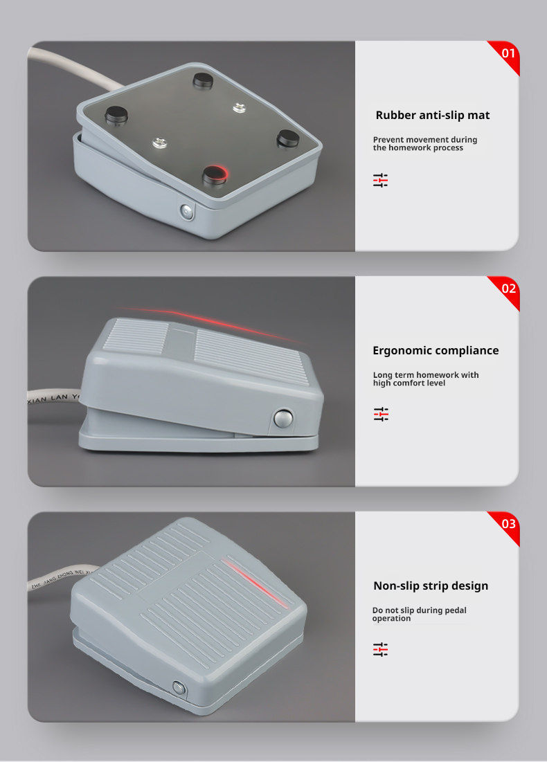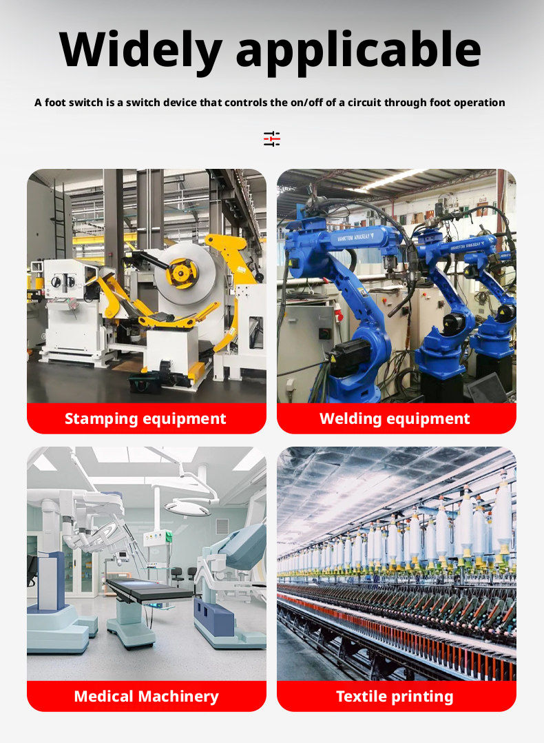 A device that controls the circuit's on/off state via foot operation, primarily designed for hands-free operation scenarios. It finds extensive application in medical, industrial manufacturing, and electronic equipment sectors.
